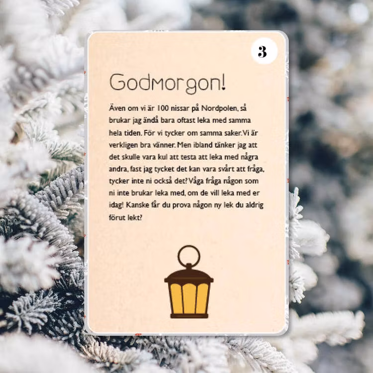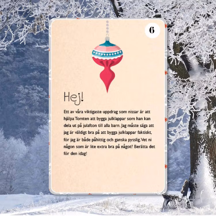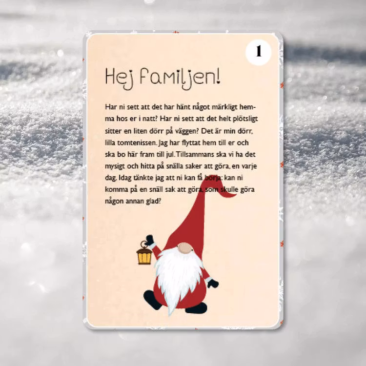Låt en liten snäll tomtenisse flytta in fram till jul! Nissen hjälper er att komma i julstämning och att räkna ner till julafton. Just den här nissen lär oss hur vi kan vara snälla på olika sätt, mot varandra och andra. Varje dag har ett nytt tema, och ett enkelt uppdrag till hela familjen. Uppdragen handlar om att uppmärksamma varandra och andra - att ta små steg mot att vara en mer empatisk och reflekterande person.