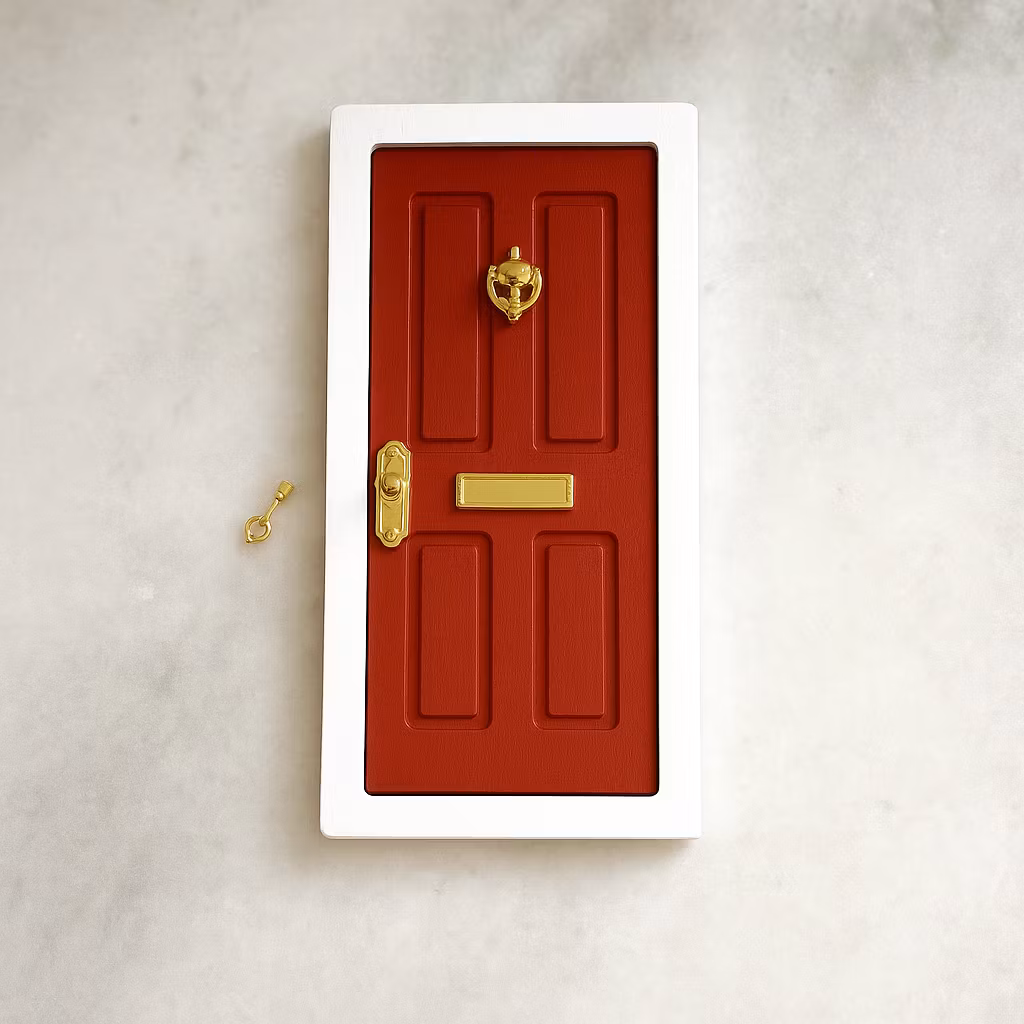 Med en djupröd färg, vit karm och gulddetaljer ger den här nissedörren ett klassiskt och juligt intryck - och skapar verkligen en känsla av att en riktig liten nisse bor hos er. Dörren är öppningsbar och inkluderar en lite nyckel i guld. Placera dörren på golvlisten, vid granen eller på en hylla, och låt barnens fantasi väckas till liv.
