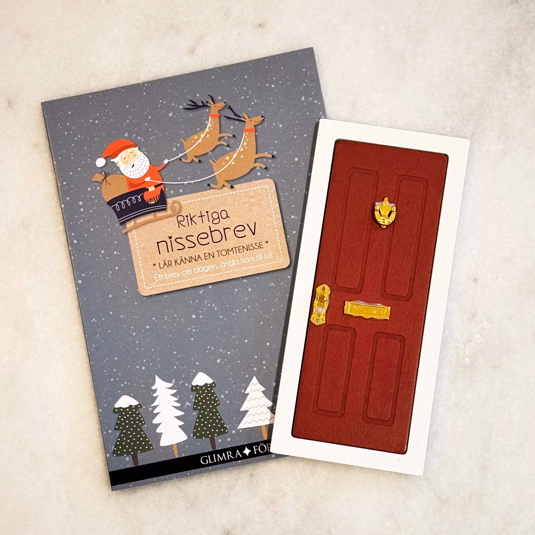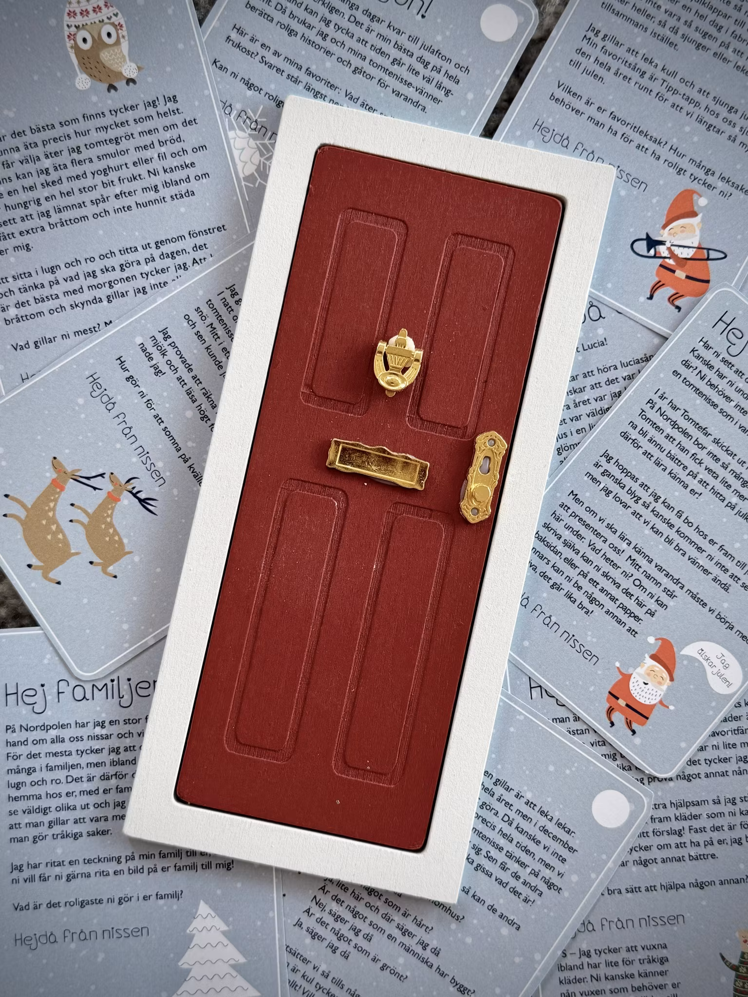 Är du ny på det här med nissebrev? Då har vi gjort det enkelt för dig. Det här paketet innehåller allt du behöver för att sätta igång, och enkelt kunna fortsätta få besök av nissen även kommande år. Nissedörren är i klassisk stil med röd dörr, vit karm och guldiga detaljer. Nissebrevet är det första i en serie om 3.